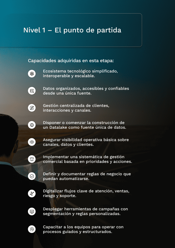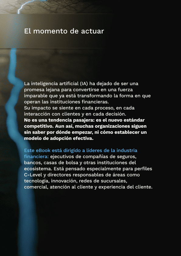 Este eBook presenta un enfoque claro y progresivo para implementar Inteligencia Artificial dentro de instituciones financieras. Encontrarás los niveles de madurez necesarios para avanzar, ejemplos concretos de impacto y una ruta práctica para adoptar IA sin fricción.